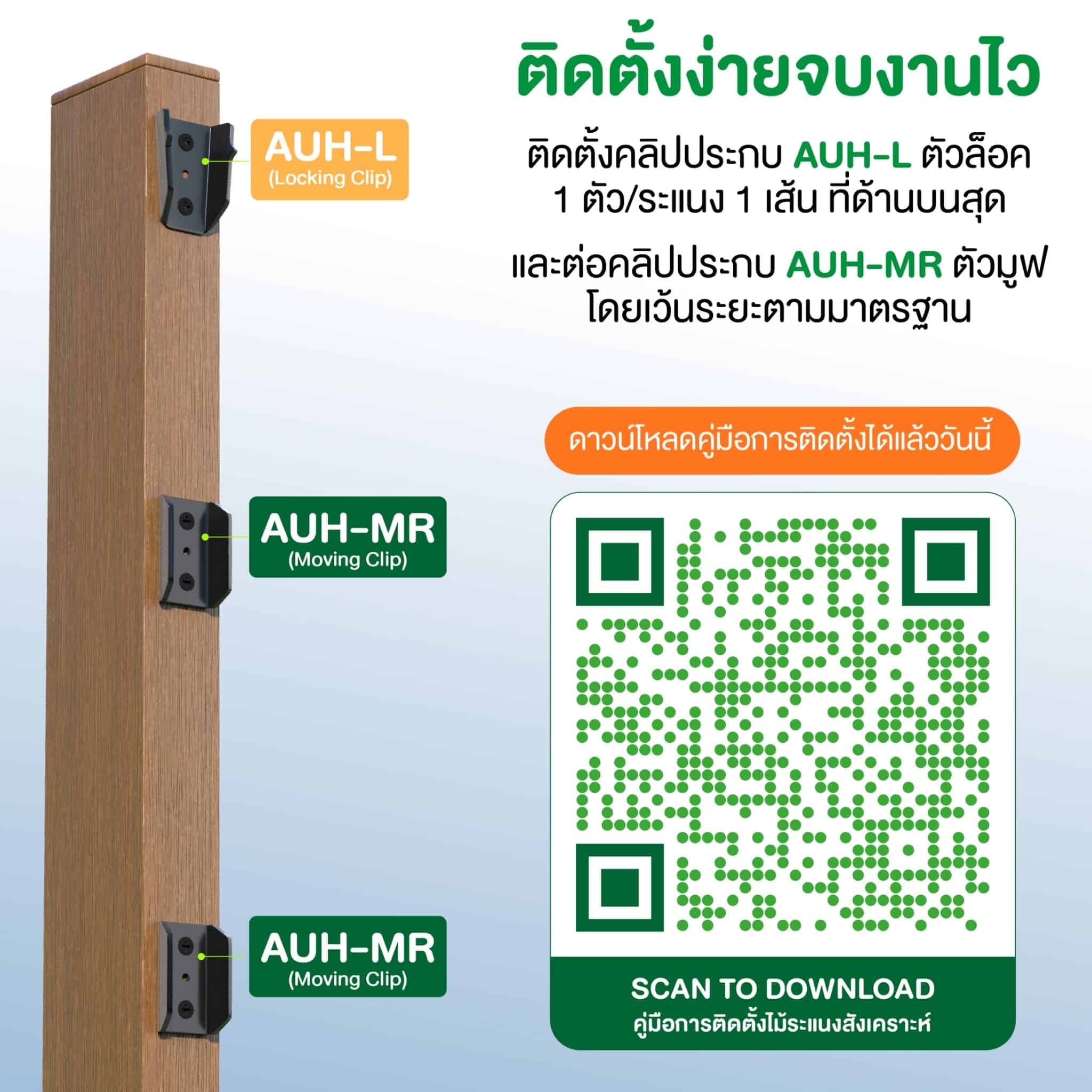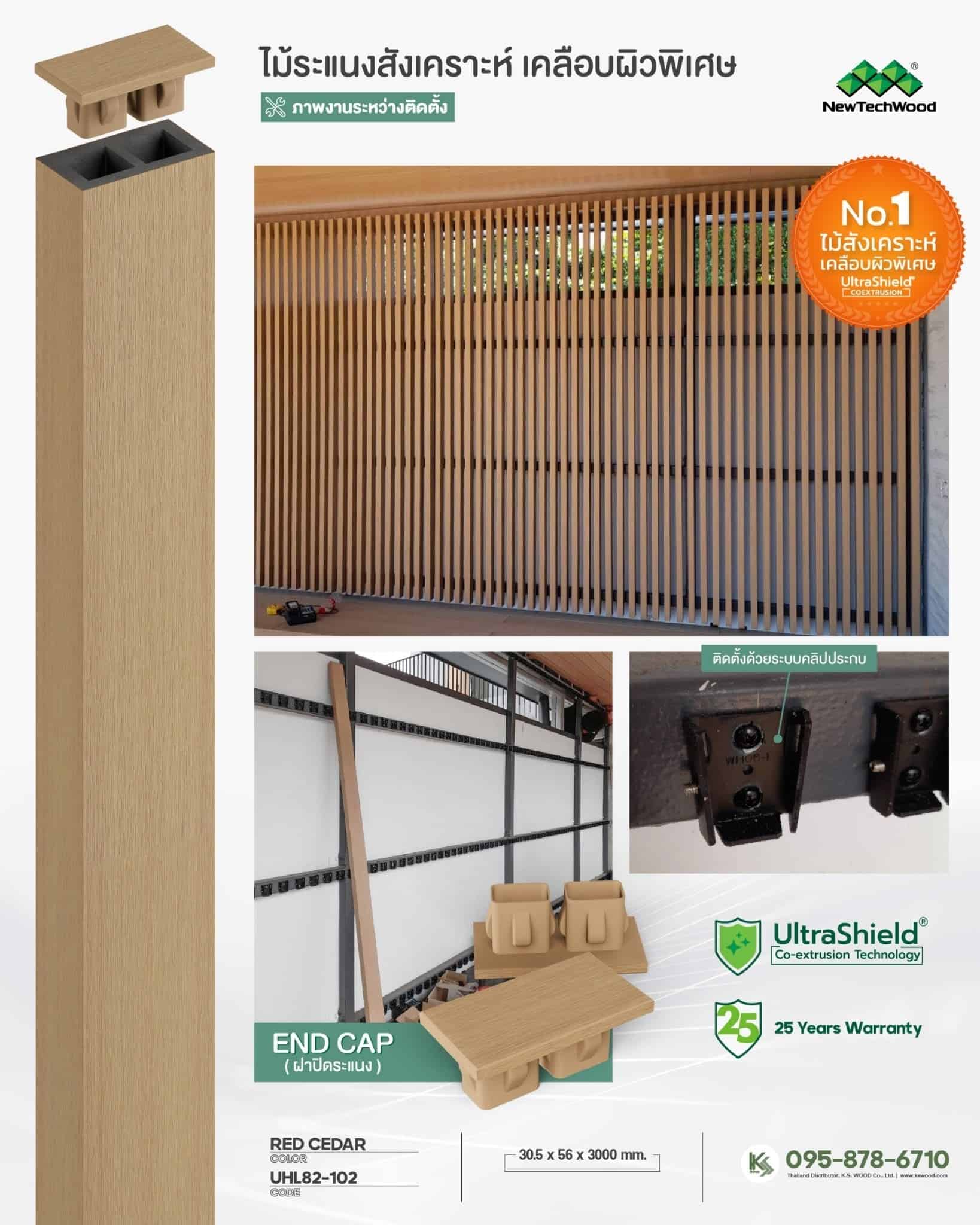 - นวัตกรรม ‘คลิปประกบ’ และ ‘เหล็กตัวยู’ ที่ออกแบบมาเพื่อยืดไม้และเพิ่มความสวยงามในการออกแบบมากขึ้น สำหรับงาน ไม้ระแนง