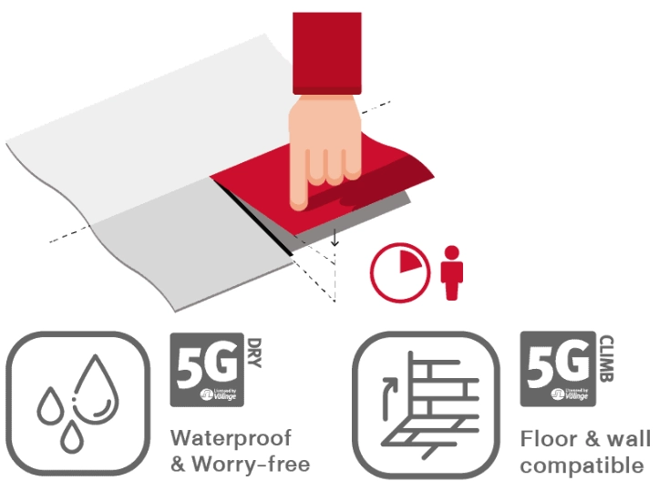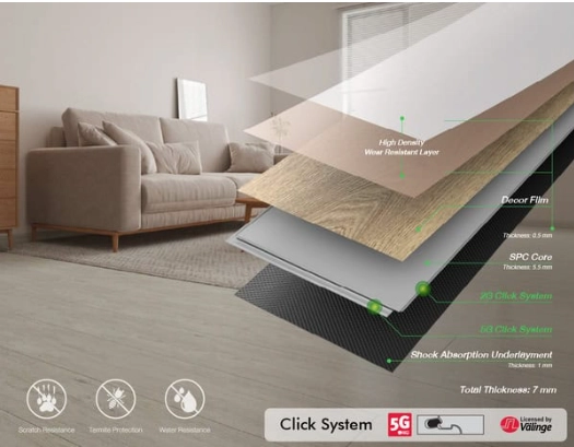 • 5G Click System (Licensed by Välinge): ยืนยันการใช้ระบบล็อกลิขสิทธิ์แท้จากประเทศสวีเดนที่มีมาตรฐานการผลิตสูงสุด ช่วยให้รอยต่อแน่นสนิทและทนทานกว่าระบบทั่วไป