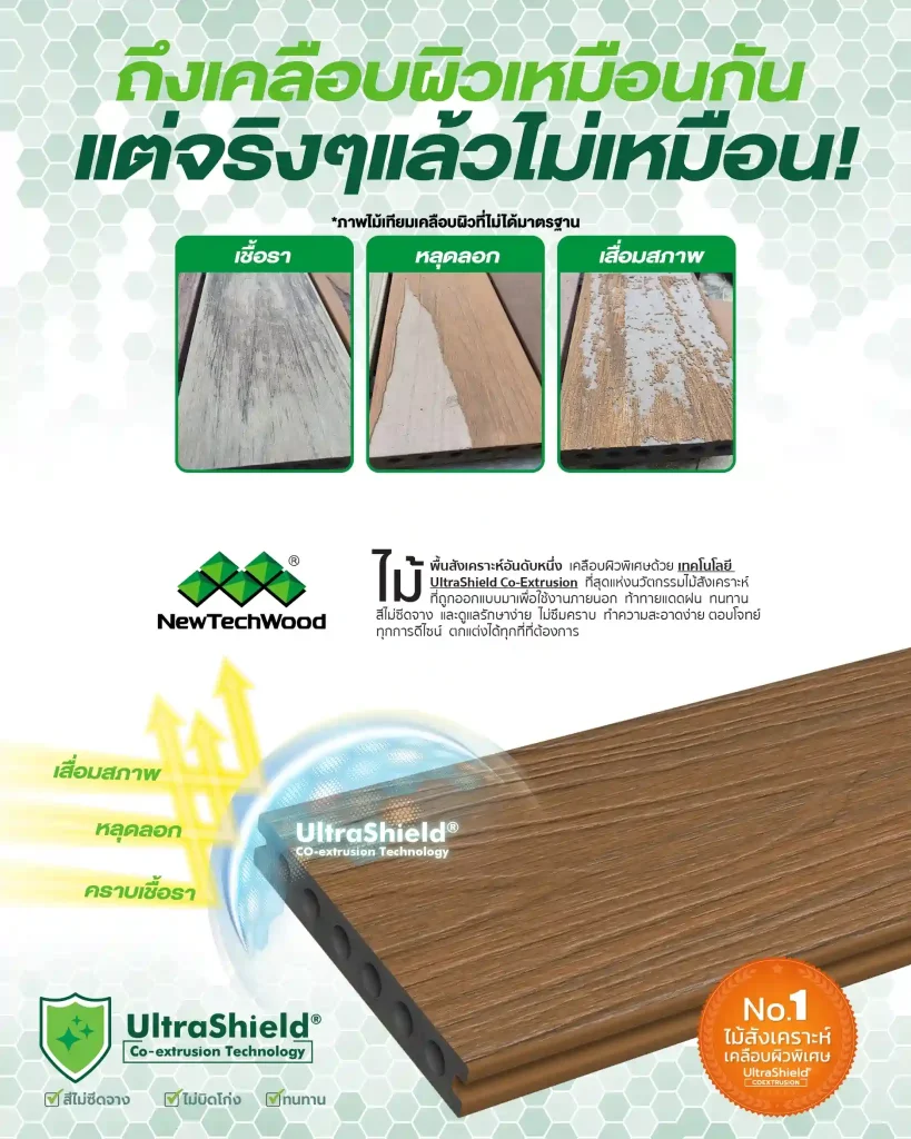 การติดตั้งในที่ร่มจะช่วยยืดอายุการใช้งานได้นานขึ้น พื้นไม้เทียม WPC รุ่นเคลือบผิว ที่ผลิตด้วยเทคโนโลยี UltraShield Co-Extrusion