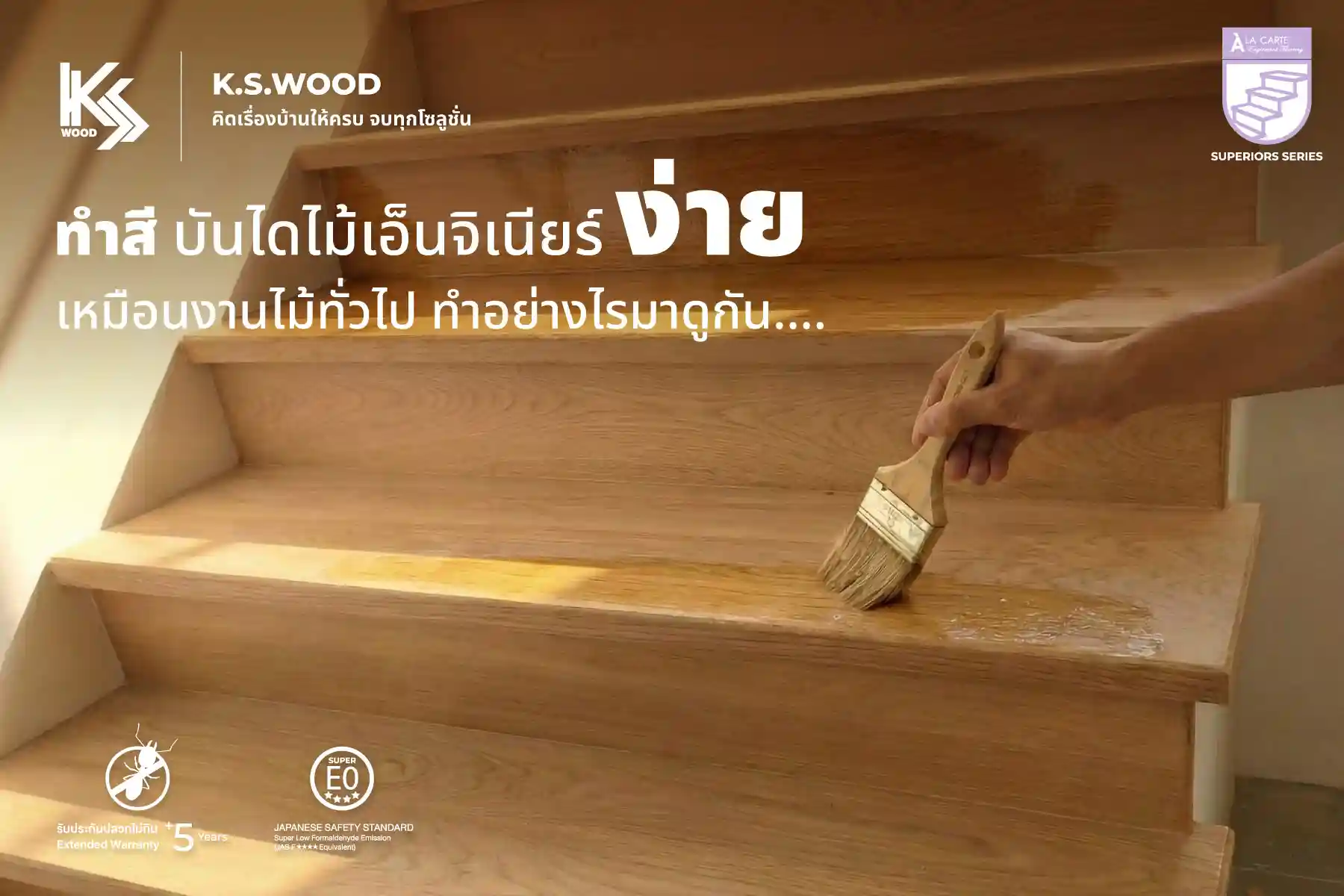 ไม้บันไดในปัจจุบัน มีหลากหลายตัวเลือกให้กับคนรักไม้ ตอบโจทย์การใช้งานมากขึ้น ซึ่งบันไดไม้เอ็นจิเนียร์ เป็นหนึ่งตัวเลือกยอดฮิตติดอันดับ ที่ทั้งผู้ออกแบบ สถาปนิก และเจ้าของบ้าน นิยมนำไปใช้กับที่พักอาศัยมากที่สุด เพราะนอกจากจะมีออปชั่นที่ทนทาน แข็งแรง วัสดุเป็นไม้จริง แต่ไม่มีปัญหาบิดโก่ง เคลือบผิวกันความชื้น หมดกังวลเรื่องปลวก และที่สำคัญ บันไดไม้เอ็นจิเนียร์ สามารถทำสีได้ตามใจ เป็นสีเดียวกันกับพื้นไม้ รวมถึงบัง ตัวจบต่าง ๆ อีกด้วย  K.S. WOOD นำเสนอวิธีการ ทำสีไม้บันไดเอ็นจิเนียร์แบบมืออาชีพ ที่ทำให้กับลูกค้า ตั้งแต่โครงการใหญ่ ไปจนถึงลูกค้าบ้านพักส่วนบุคคล เราใส่ใจในทุกขั้นตอน คุณสมบัติของไม้บันไดเอ็นจิเนียร์ ที่สามารถทำสีได้ บันไดไม้เอ็นจิเนียร์จาก ACC Wood Stair ของ K.S. WOOD เป็นบันไดไม้จริงเต็มแผ่น โครงสร้างไม้เอ็นจิเนียร์ 15 ชั้น ความหนาถึง 30 มม. วางสลับเสี้ยน เพิ่มความแข็งแรง ลดการบิดงอ ด้วยโครงสร้างแบบนี้ ทำให้สามารถ ขัด ย้อมสี และเคลือบผิว [...]
